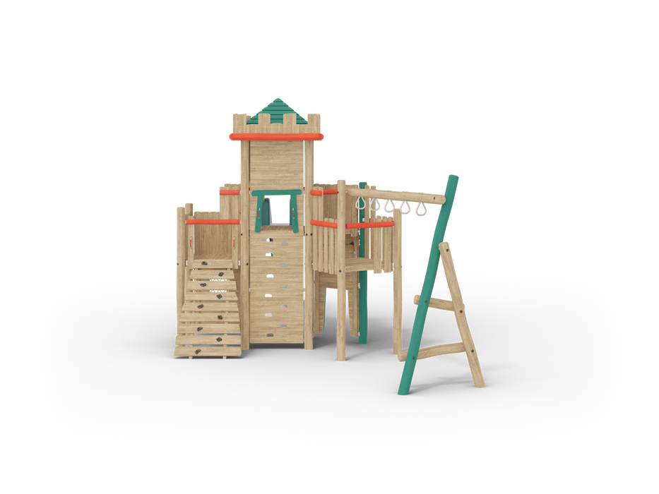 Step into the medieval world of Fortress Adventure, a playground that combines the thrill of exploration with the charm of a fortified castle. This compact yet dynamic structure features a towering keep with a long slide for swift escapes and a challenging monkey bar set to test strength and agility. Perfect for young knights and adventurers aged 4-10, Fortress Adventure inspires imaginative play and physical activity. Defend the castle, plan daring rescues, or simply enjoy hours of fun in this versatile medieval-themed play area!