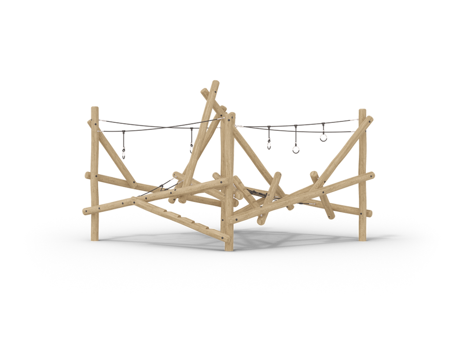 Тази дървена конструкция за детска площадка е сложна рамка за катерене със смесица от ъглови греди, въжета и централна мрежа за катерене, създаваща слоеста, приключенска настройка. Гредите образуват триъгълна, отворена пирамидална форма, осигуряваща различни пътеки за катерене, докато окачените халки добавят допълнително предизвикателство за гъвкавост. Структурата насърчава активната игра, тъй като децата могат да навигират, балансират и се люлеят през различните елементи. Неговият дизайн от естествено дърво се вписва добре в обстановка на открито или тематика за природата, като приканва към въображение и физическо изследване.
