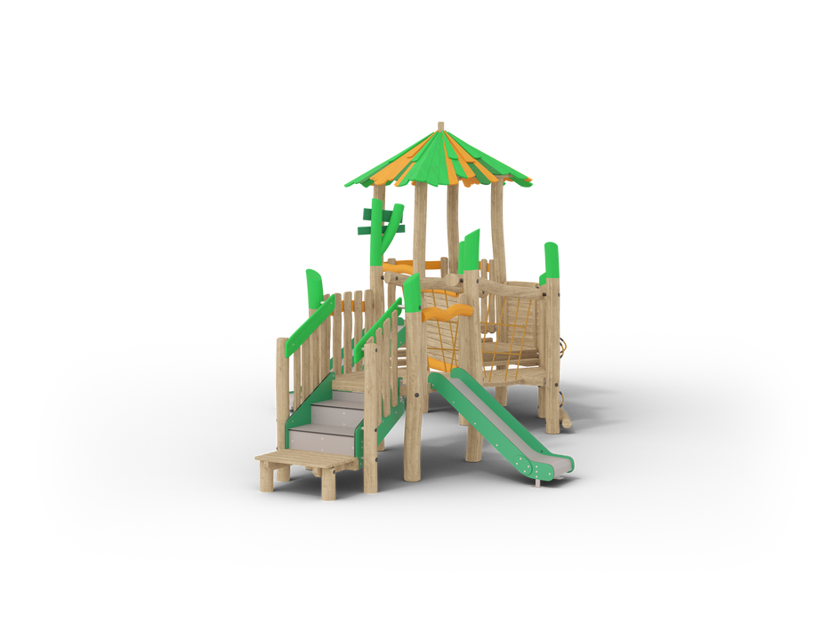 This jungle-themed playground structure features a vibrant tower with a green and yellow thatched roof, accessible via a small wooden ramp. The structure includes two green slides for quick descents and various climbing elements, such as a rope net and a climbing wall. The platforms are interconnected, offering multiple play zones and encouraging exploration. The natural wood materials and bright accents enhance the jungle atmosphere, creating an exciting and adventurous space for children to play.