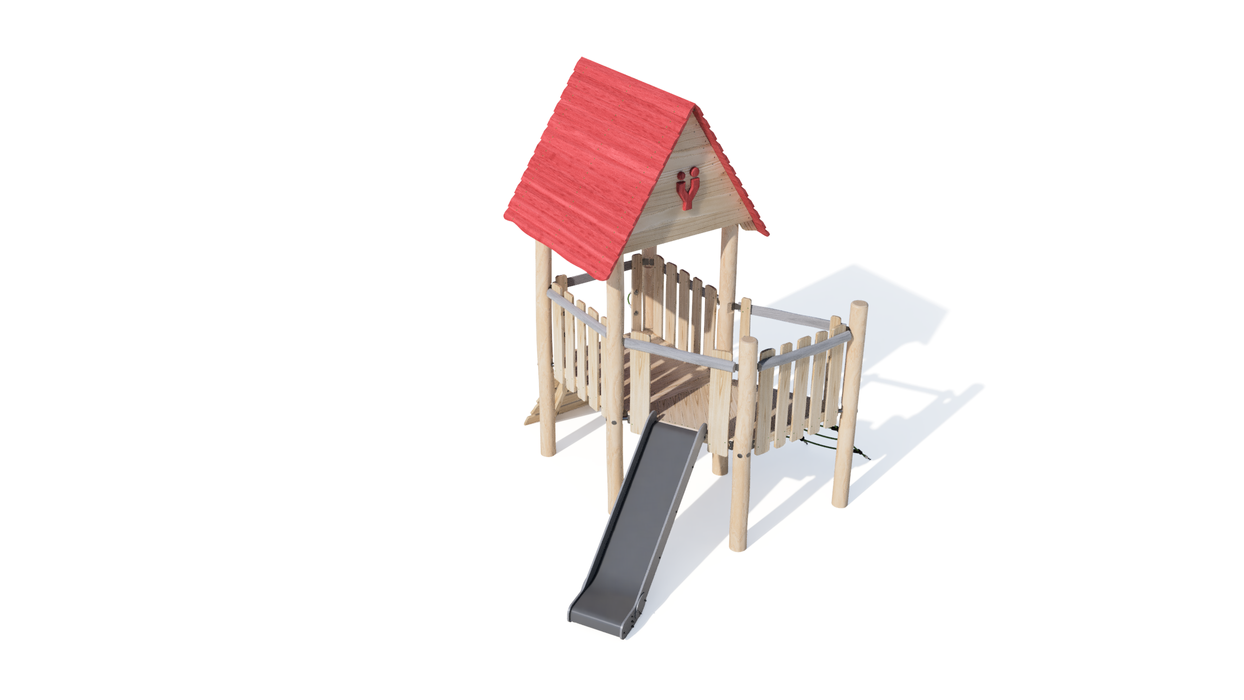 Тази структура за детска площадка се отличава със здрава рамка от естествено дърво с покрив като на къща в зелено. Наклонена дървена стена за катерене с ярко оцветени дръжки осигурява достъп до повдигнатата платформа, която е оградена с дървена ограда и червено предпазно въже за допълнителна сигурност. От платформата жива червена пързалка леко се извива надолу, предлагайки плавен изход. От едната страна има и мрежеста рампа за катерене, пр едназначена да насърчава уменията за катерене и балансиране. Двуъгълният изглед показва простотата и гъвкавостта на дизайна на къщичката за игра, идеална за забавление на открито и физическа активност.