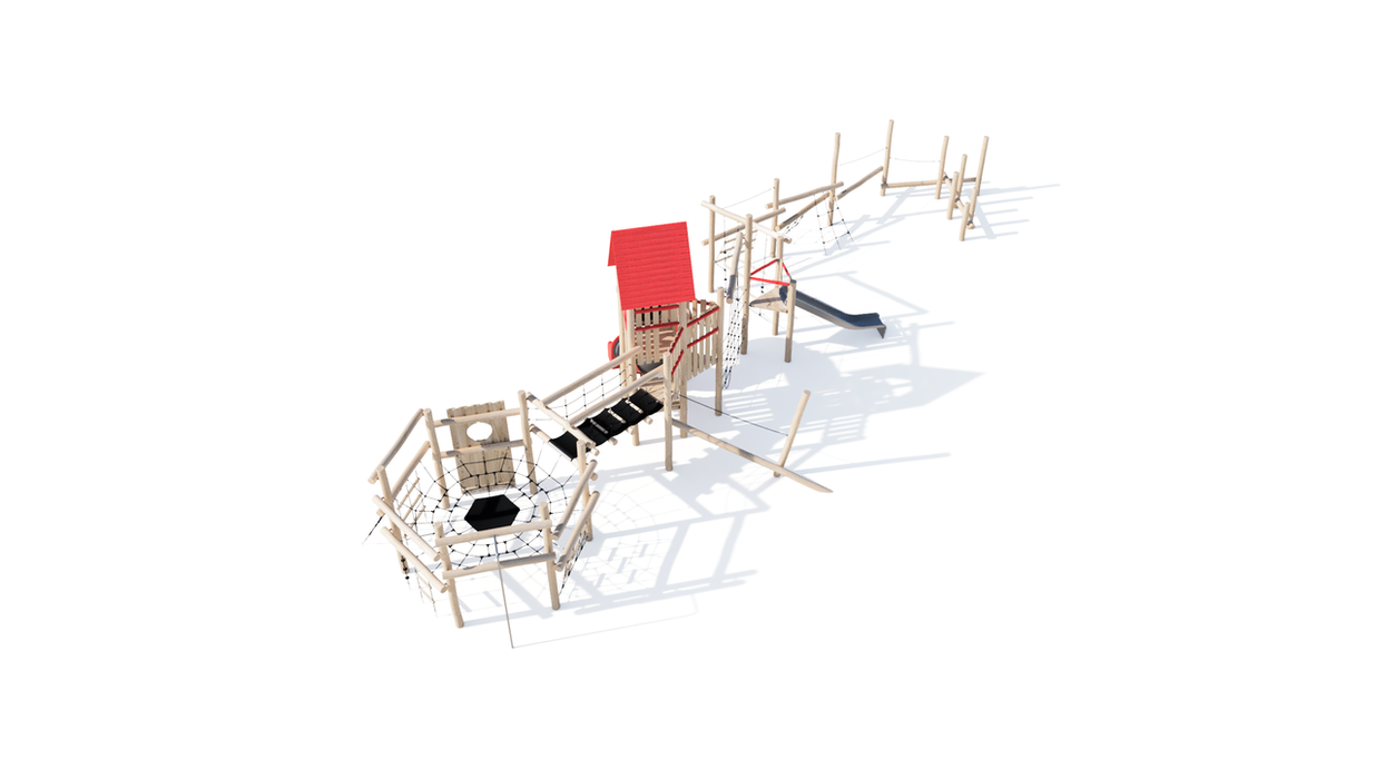 The playground features a central tower with a red pitched roof, serving as a visual focal point and main access node. From the tower, multiple play elements extend, forming a connected play route that encourages exploration and movement.