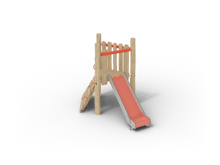The playground equipment consists of a wooden structure with multiple components designed for small children. It features a red slide and climbing steps, handrails. The equipment is supported by sturdy wooden posts and beams, ensuring safety and durability.