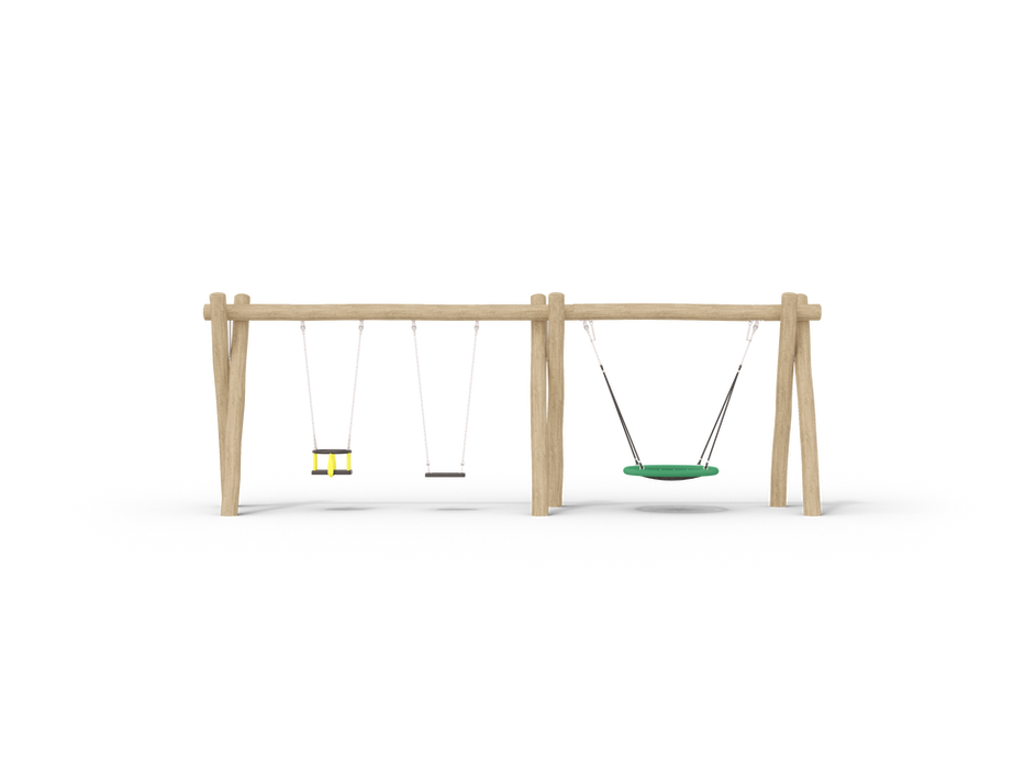 This playground swing set combines three different types of swings on a long wooden A-frame. On the left, there is a baby swing with a bucket seat for toddlers, offering a safe and secure option. In the middle, a traditional swing with a flat seat caters to older children. On the right, there is a nest swing with a circular, webbed seat, allowing group play for multiple children. The natural wooden frame gives the structure a sturdy and rustic look, making it versatile for children of various age groups.