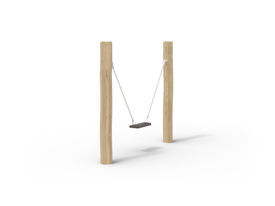 This playground swing set features a minimalist design with two vertical wooden posts supporting a single flat-seated swing. The swing is suspended by metal chains attached to the top of each post, providing a stable and simple structure. The absence of a horizontal beam gives it an open, airy feel, while still maintaining functionality. The natural wood posts add a rustic touch, blending well with outdoor environments. This setup is designed for individual use, offering a straightforward, durable swing experience.